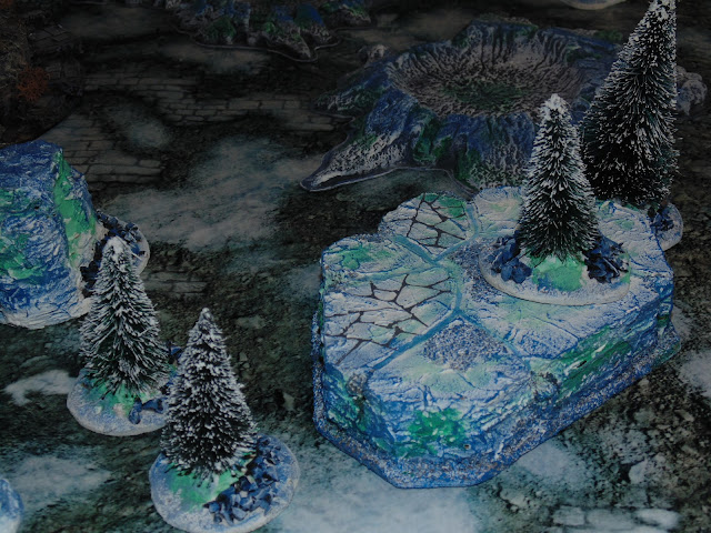 So I have been working on some cheap coniferous type trees, some ice shards, frozen outcrops and snow/ice fields. The Snow fields I posted a while back, but here they have been repainted and added to all the other terrain..