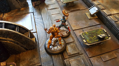 Featured in this very straight forward, "get used to the rules game" I had Cap from the Avengers playing against Sabretooth of the BOEM (Brotherhood of Evil Mutants) The scenario was, Sabretooth was tasked to find data linked with Tony Starks Ultron Initiaitive, blue prints and consrtruction plans etc. He has to check the main consols in the large industrial complex, you'd have thought they would all be linked but no, to find the data, 4 in total, use a Power, make a Willpower check and then throw any double for the consol to contain the info on 2 d8.