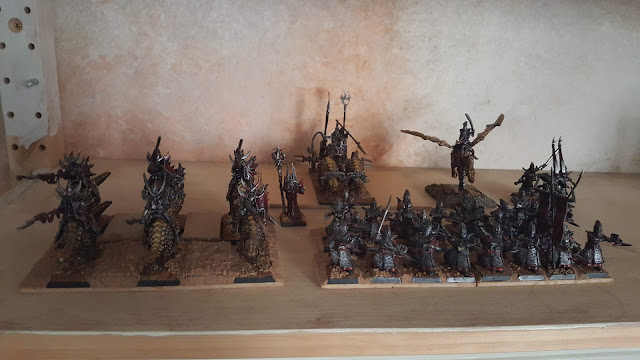 I gathered up all the broken bits I had set aside for Mrs Daxio's Twighlight Kin 1000 point army, after one of the cats had demolished the box they were in; got them all stuck back together and rebased for Kings of War.