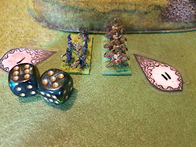 Despite 28 wounds, over their nerve, I rolled snake eyes which keep the horde in the game for now. More importantly it opens up the Roams to counter charges.